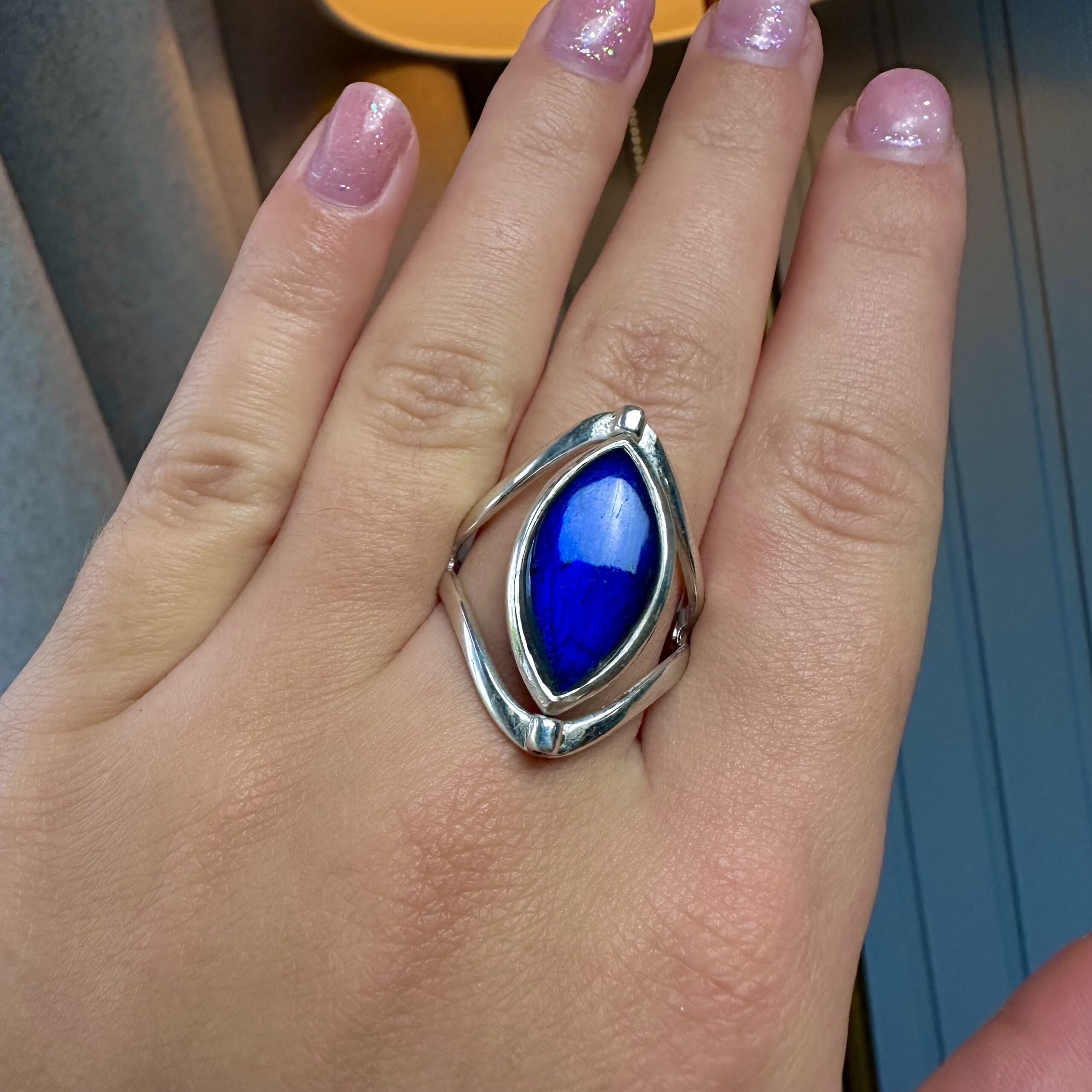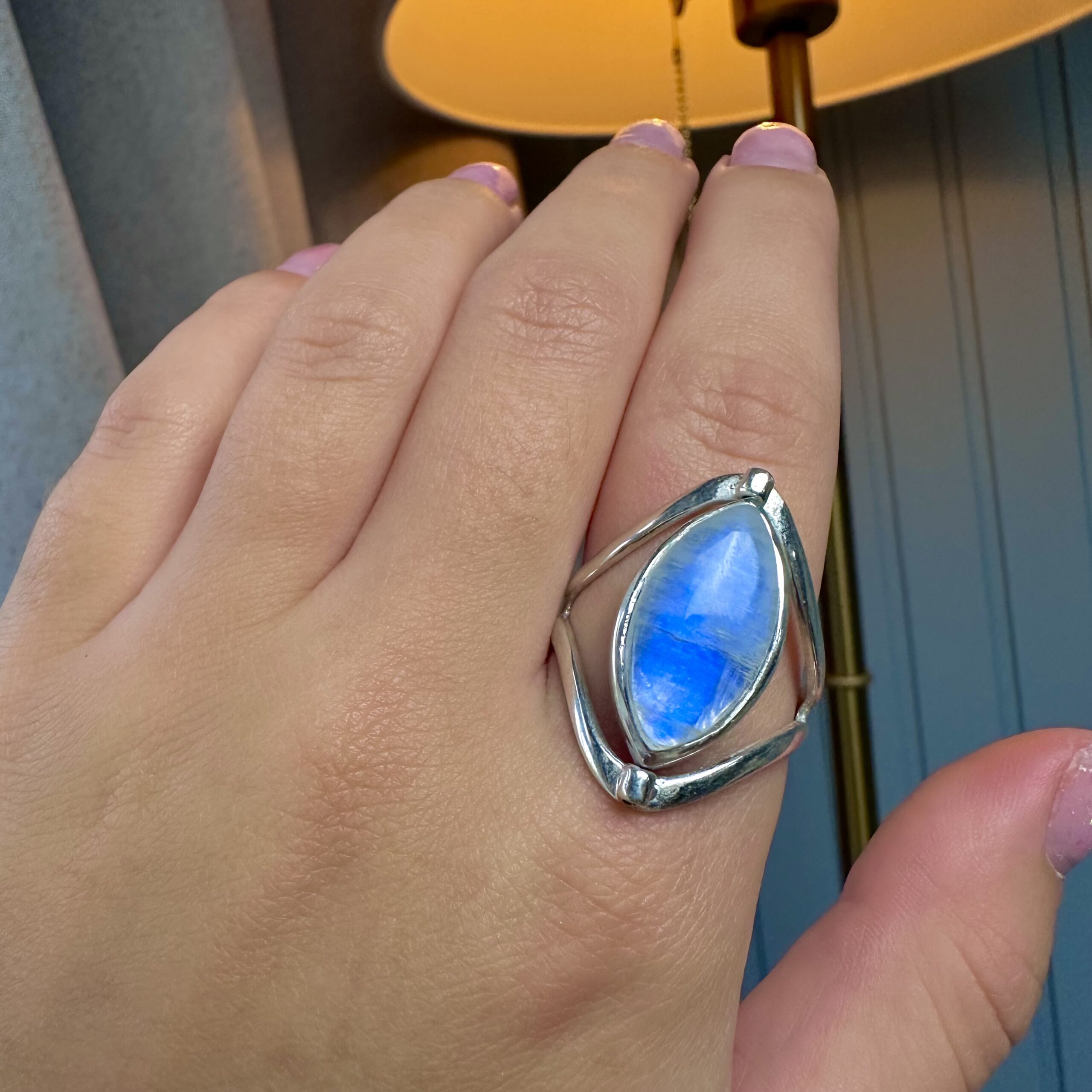 Step into a world of mysticism and light with this handcrafted sterling silver ring, showcasing Moonstone on one side and Labradorite on the other.
