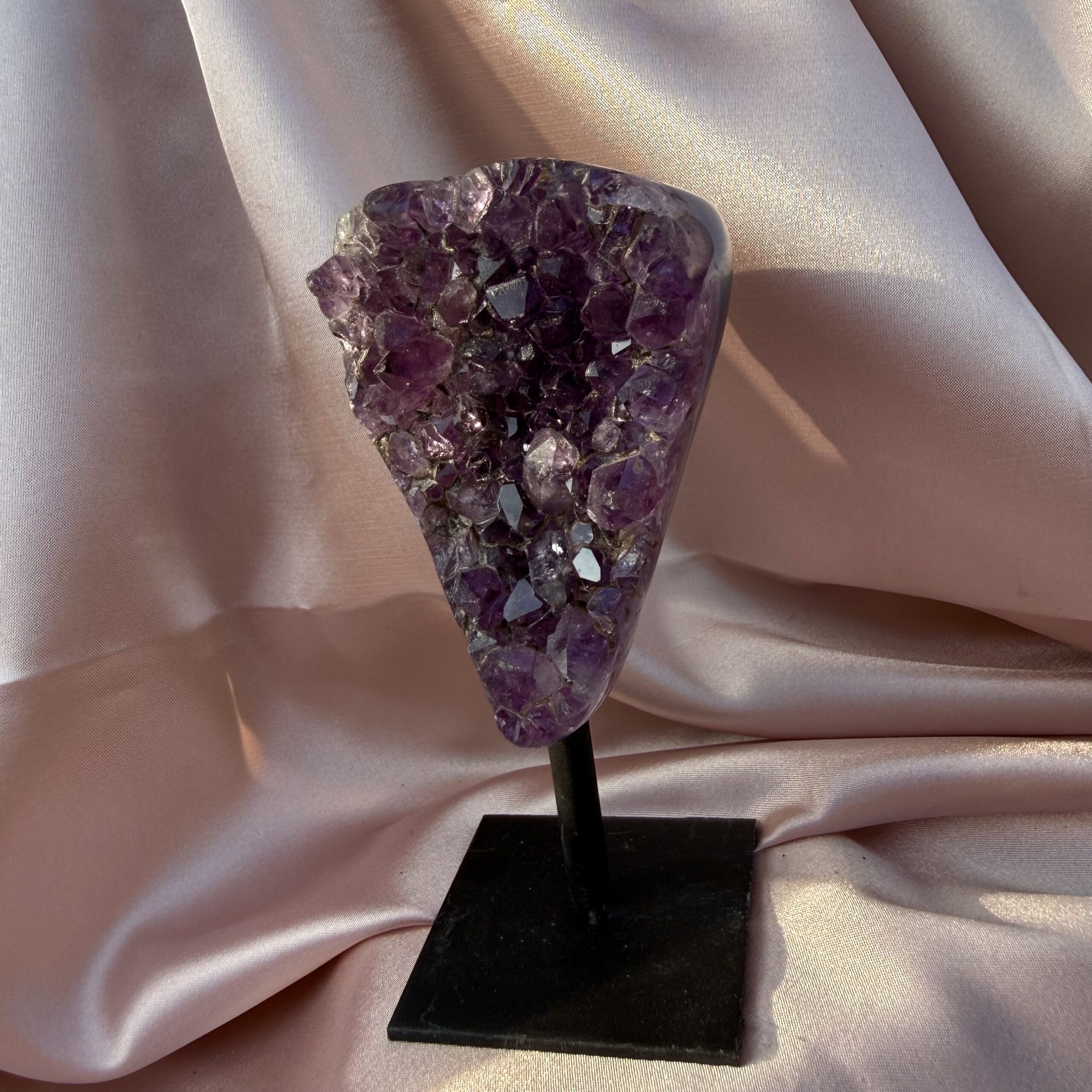 - Sparkling amethyst crystal center with calming energy