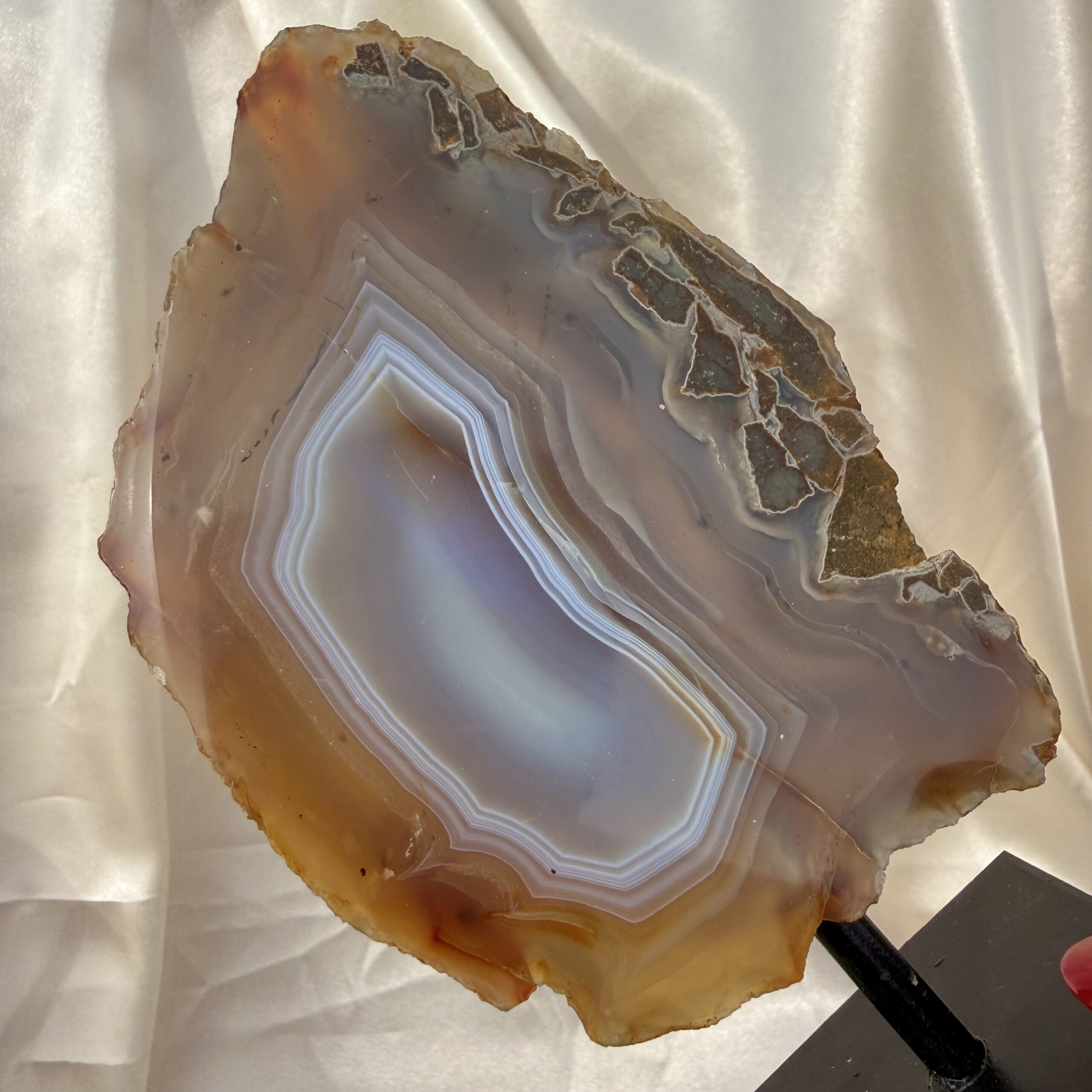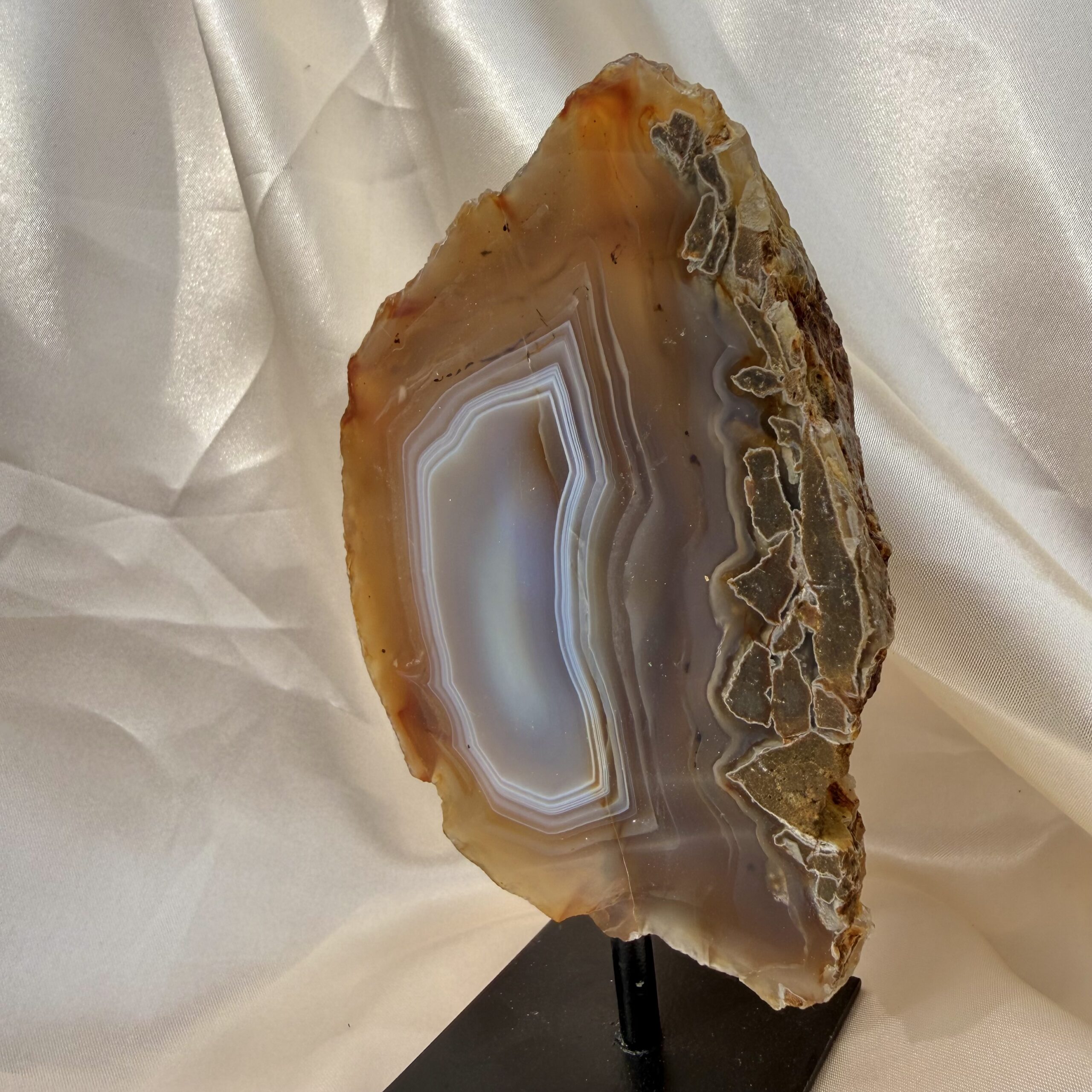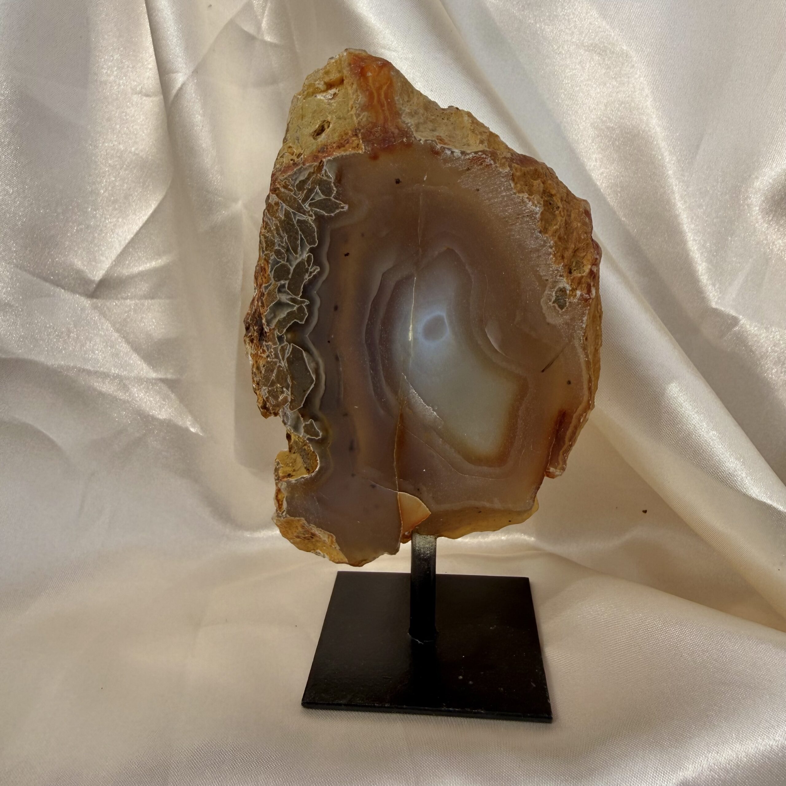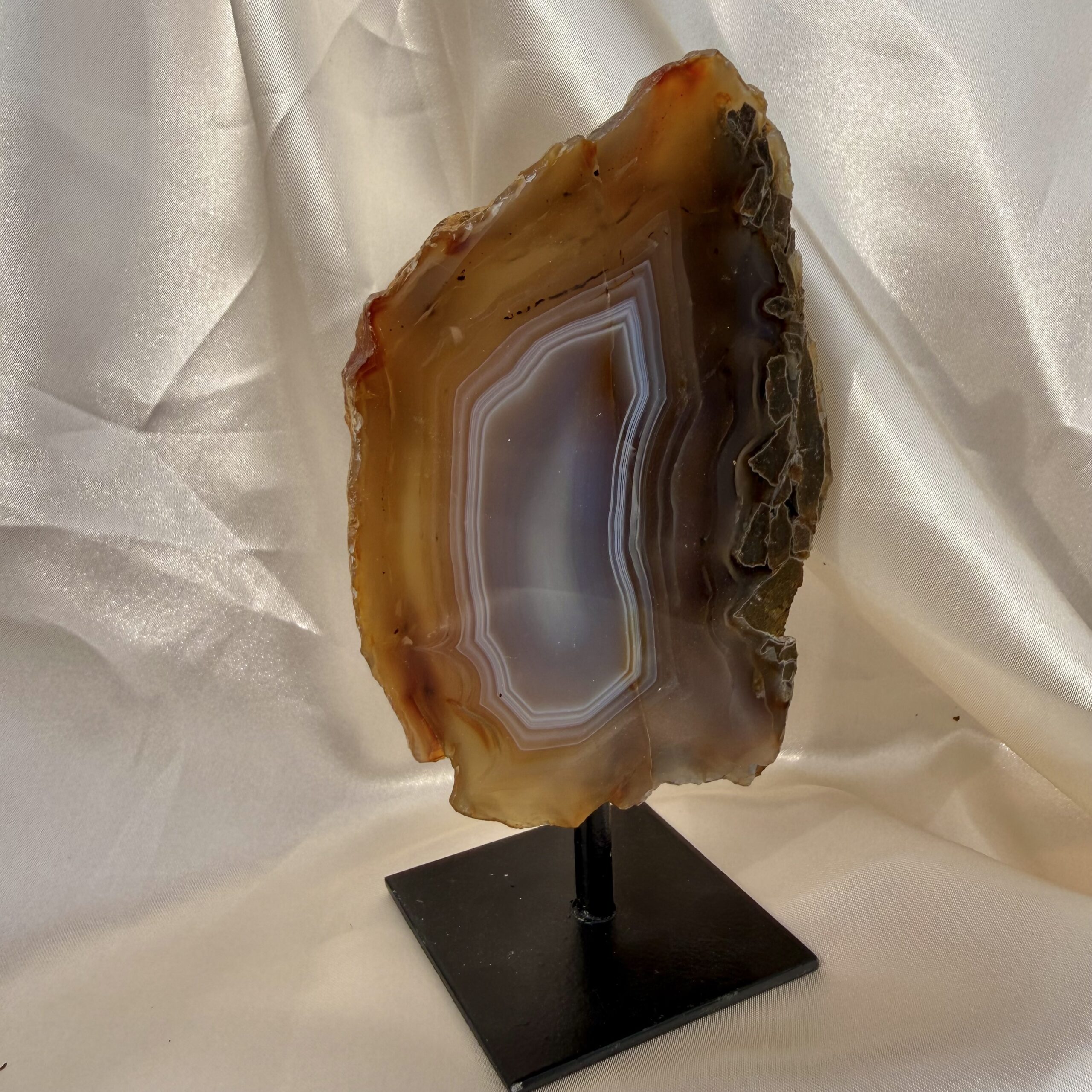 This carnelian agate on stand radiates rich, sunlit tones — flowing layers of amber, burnt orange, and deep honey that move through the stone like captured warmth. The natural agate banding adds depth and rhythm, creating a sense of movement that feels both grounding and alive.