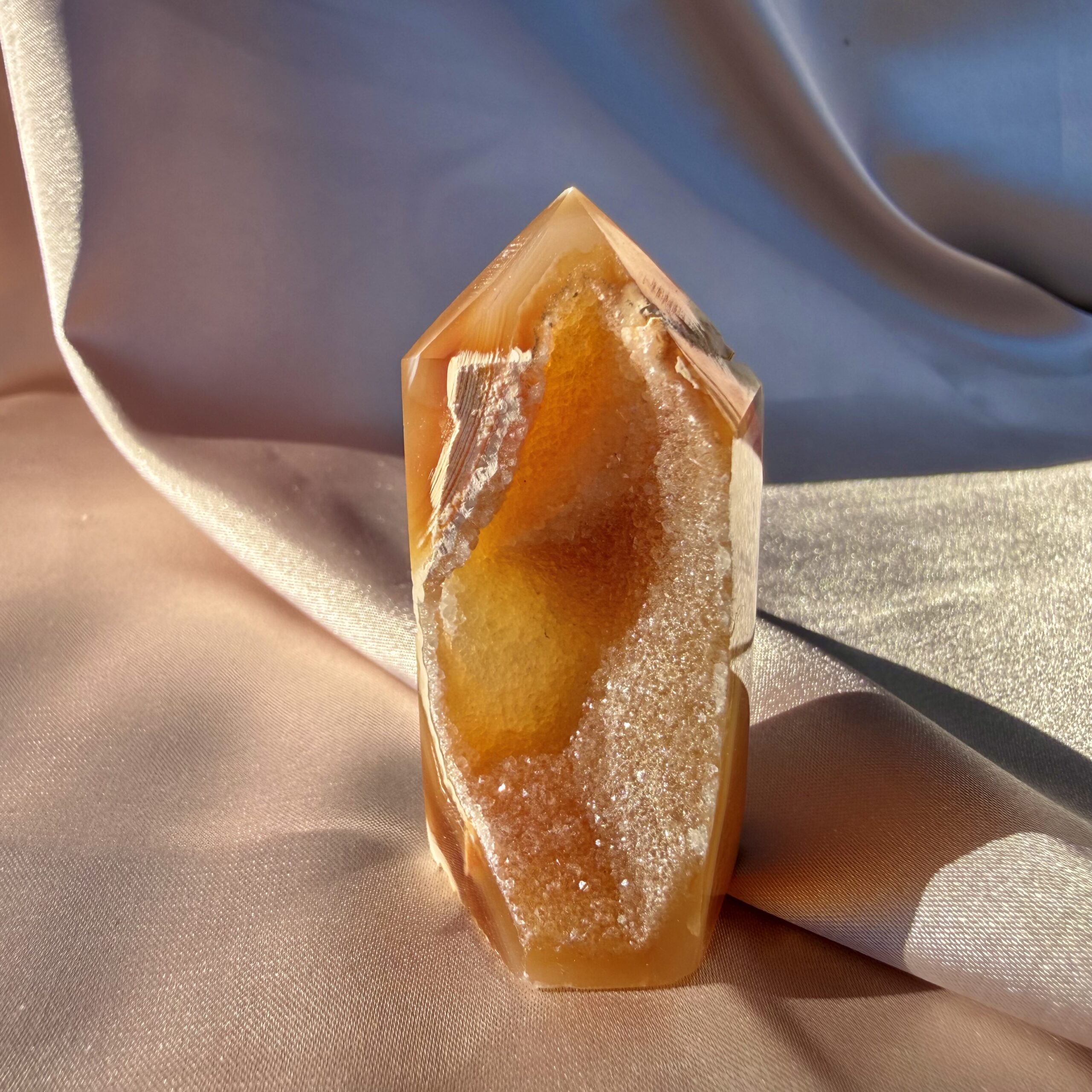 A flame captured in stone, this druzy carnelian tower radiates warmth, strength, and quiet confidence. Its rich hues β glowing amber, deep rust, and sunlit orange β feel alive, like a slow-burning ember that never fades.