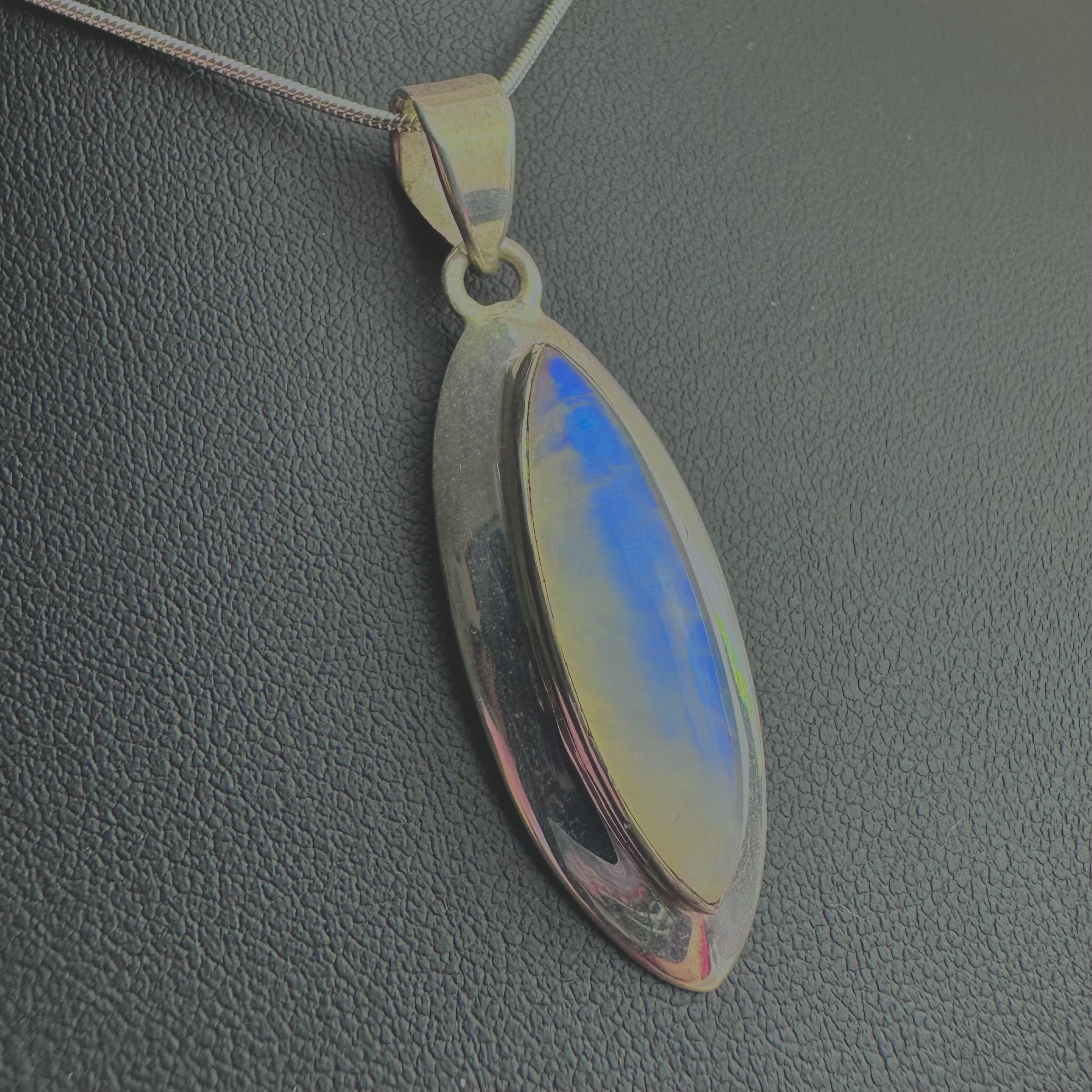 Experience the allure of the celestial with my one-of-a-kind rainbow moonstone pendant, nestled within a unique sterling silver setting. The iridescence of the moonstone captures the essence of the night sky, offering a mesmerizing display of colors with every movement. This statement piece is not just jewelry; it’s a symbol of elegance and individuality. As a special touch, it comes with a free necklace, ensuring effortless wearability and versatility. Embrace the enchantment of this exquisite pendant and let its radiant beauty illuminate your every moment.