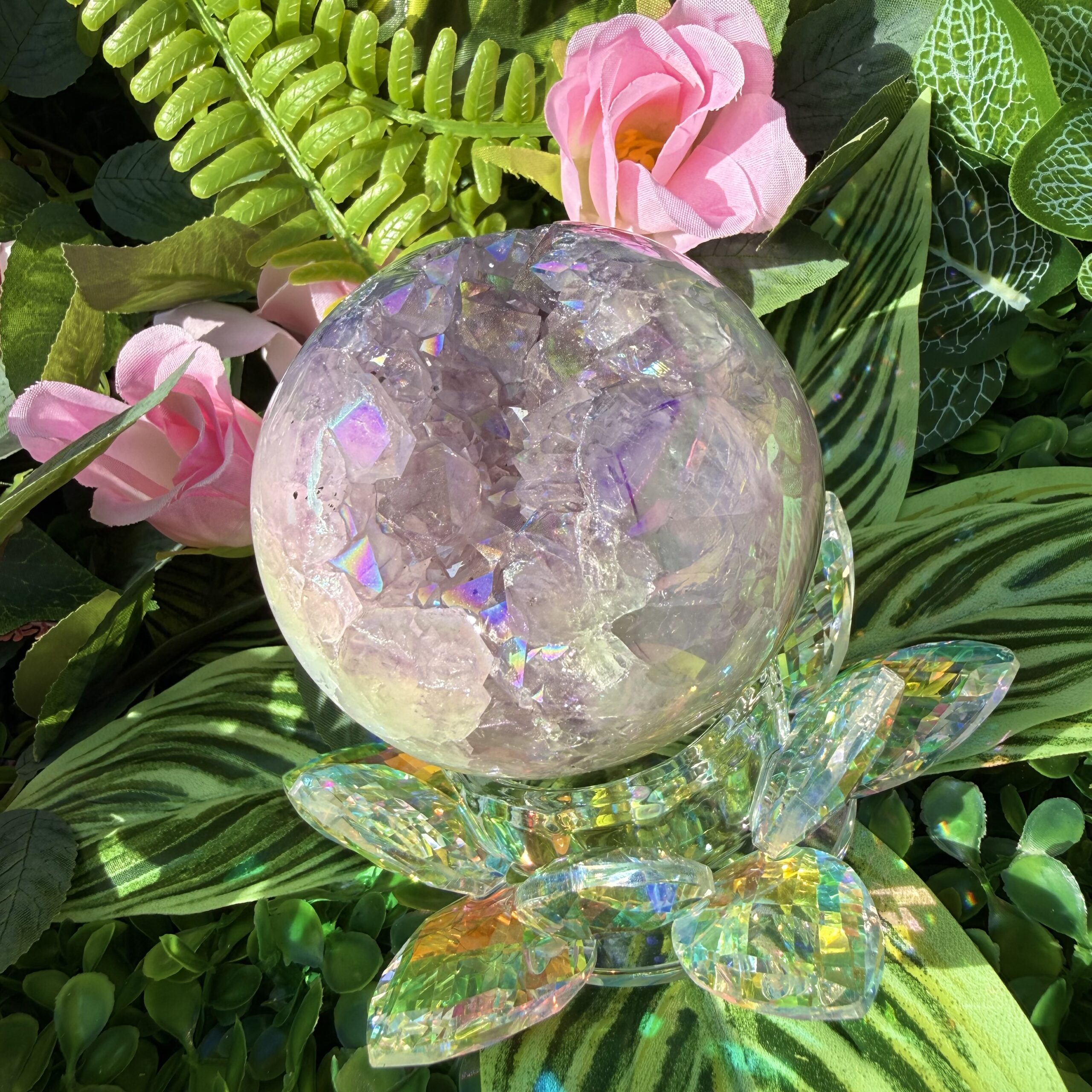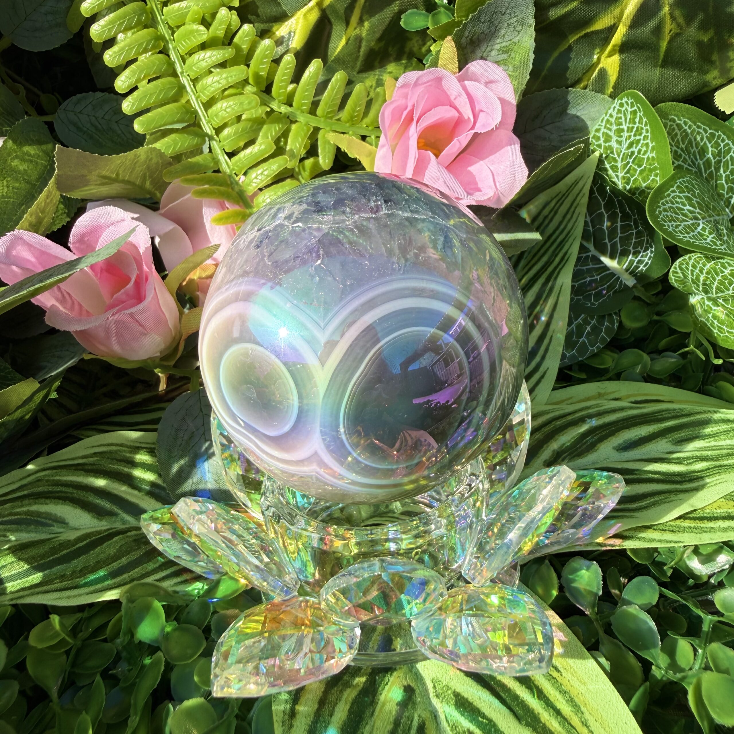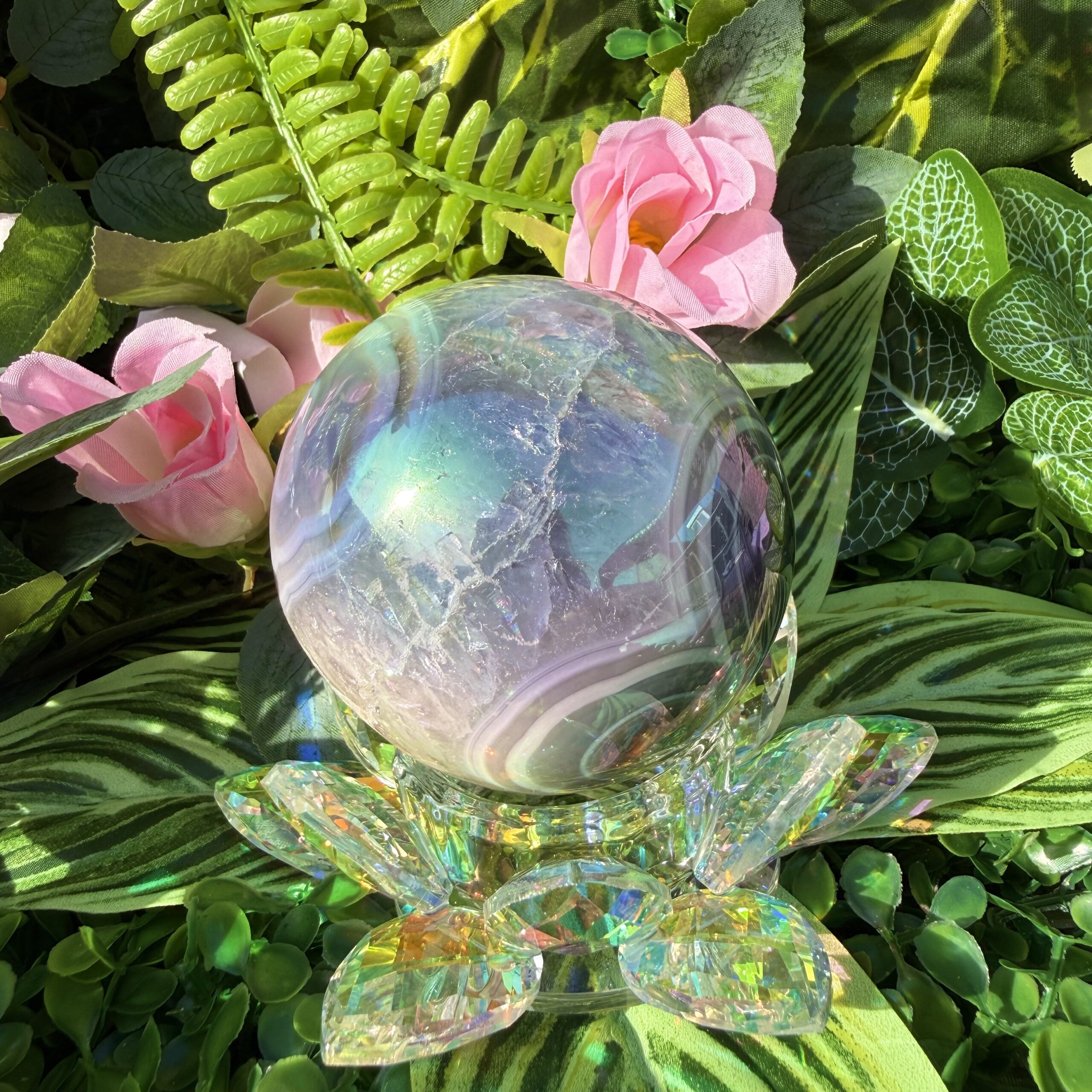 Crafted with care and precision, this sphere reflects exceptional craftsmanship. Shaping such dense material into a perfectly balanced orb, then finishing it with an angel aura treatment, requires both skill and patience… and it shows.