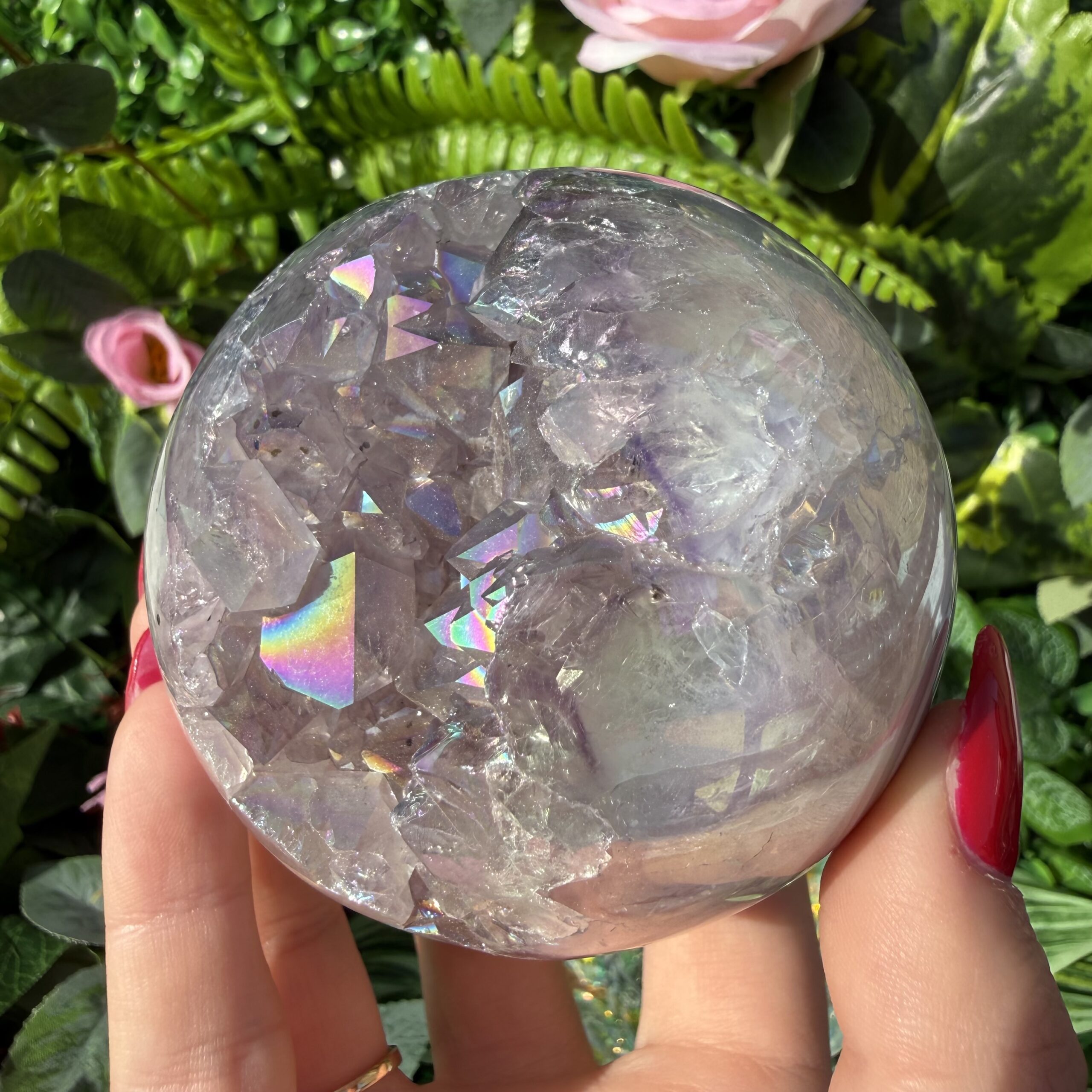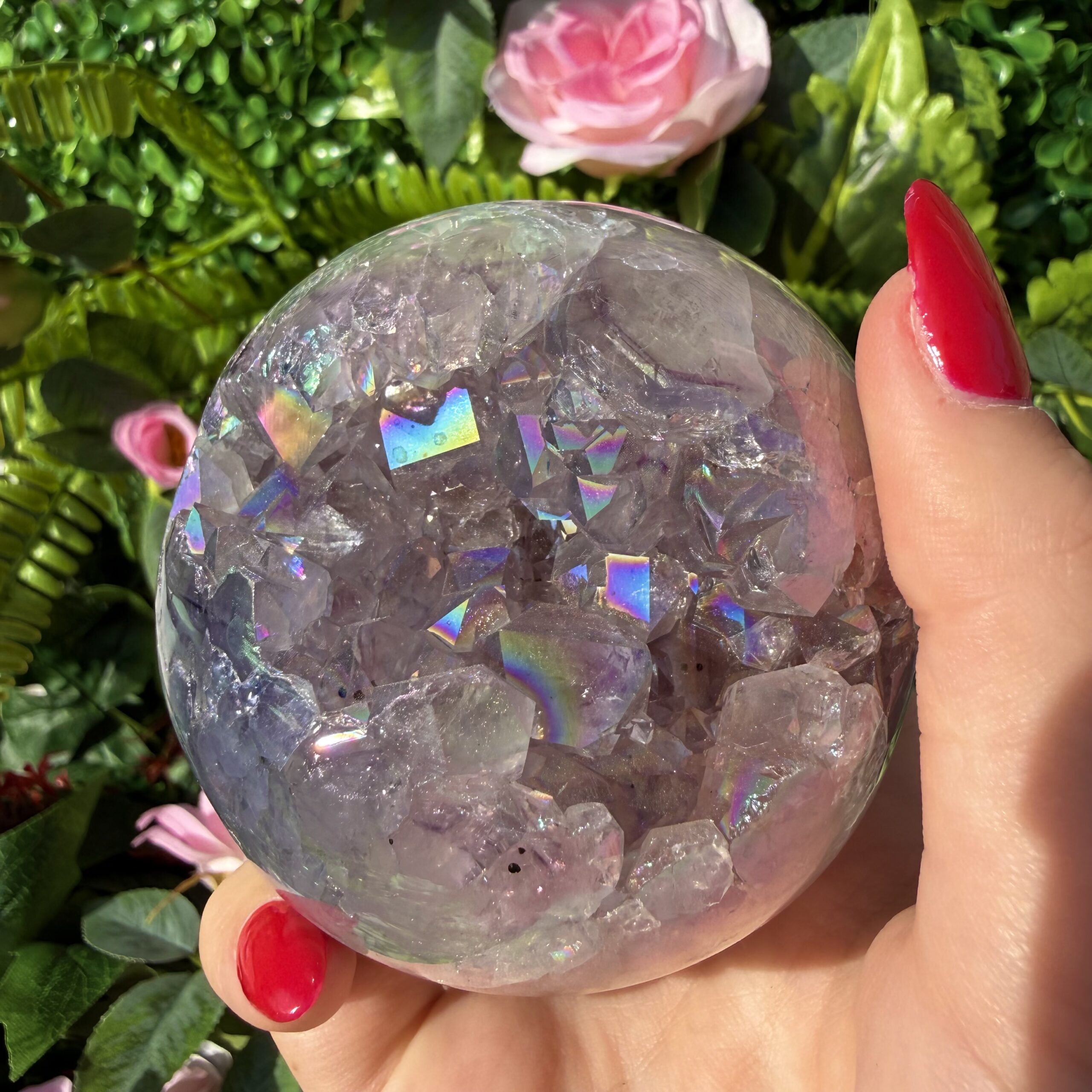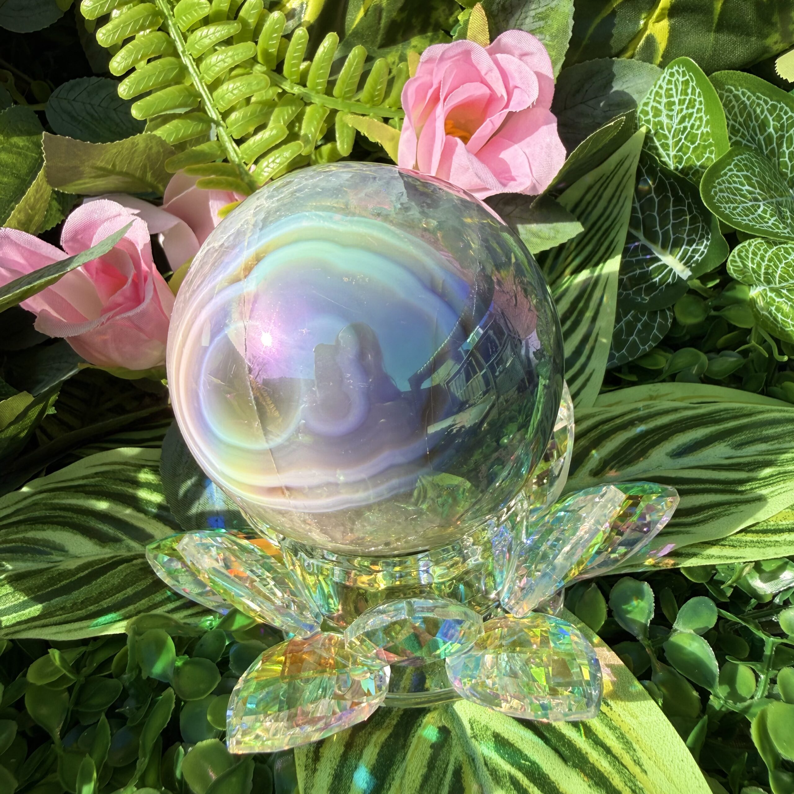 Crafted with care and precision, this sphere reflects exceptional craftsmanship. Shaping such dense material into a perfectly balanced orb, then finishing it with an angel aura treatment, requires both skill and patience… and it shows.