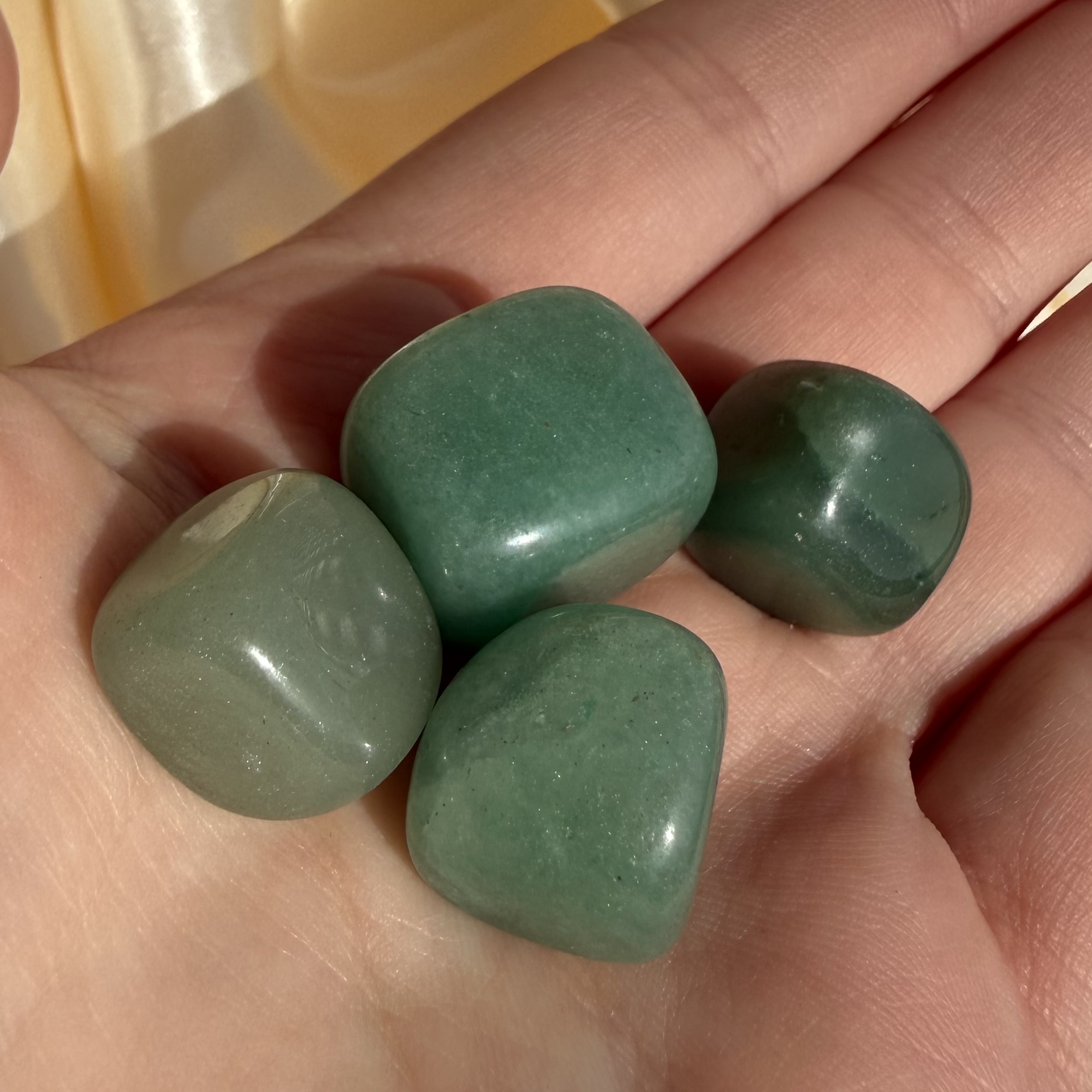 These beautiful green aventurine tumble stones are smoothly polished, revealing soft green tones ranging from light, fresh shades to deeper earthy hues.