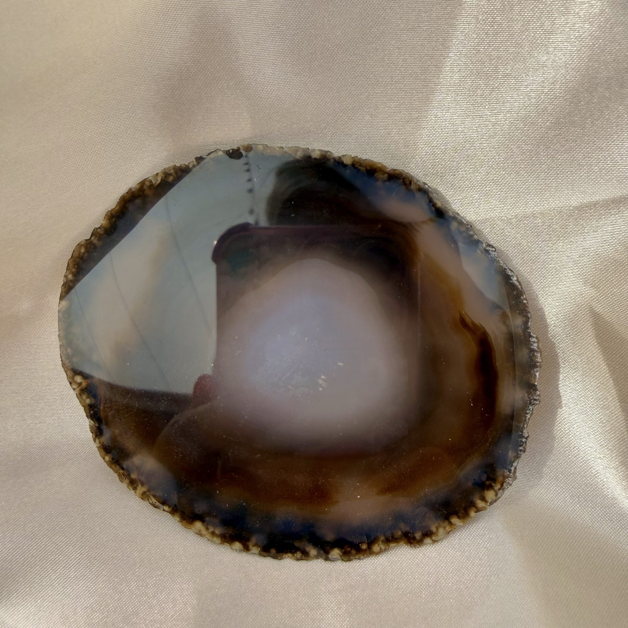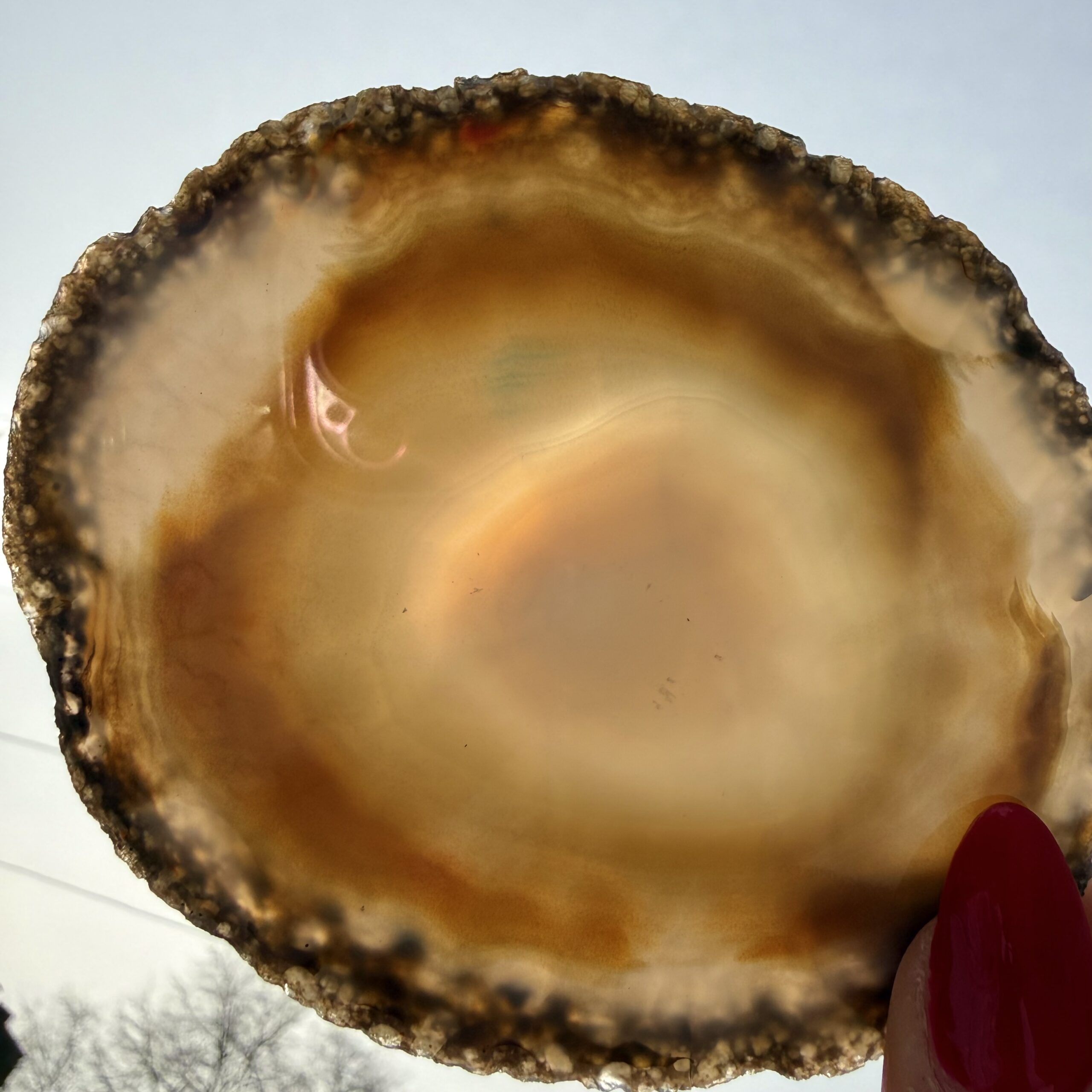 The colors are rich and beautifully balanced, ranging through warm earth tones, soft neutrals, or vibrant hues depending on the piece — all enhanced by the stone’s natural translucency. When light passes through, the slice comes alive, glowing softly and highlighting every delicate layer within.