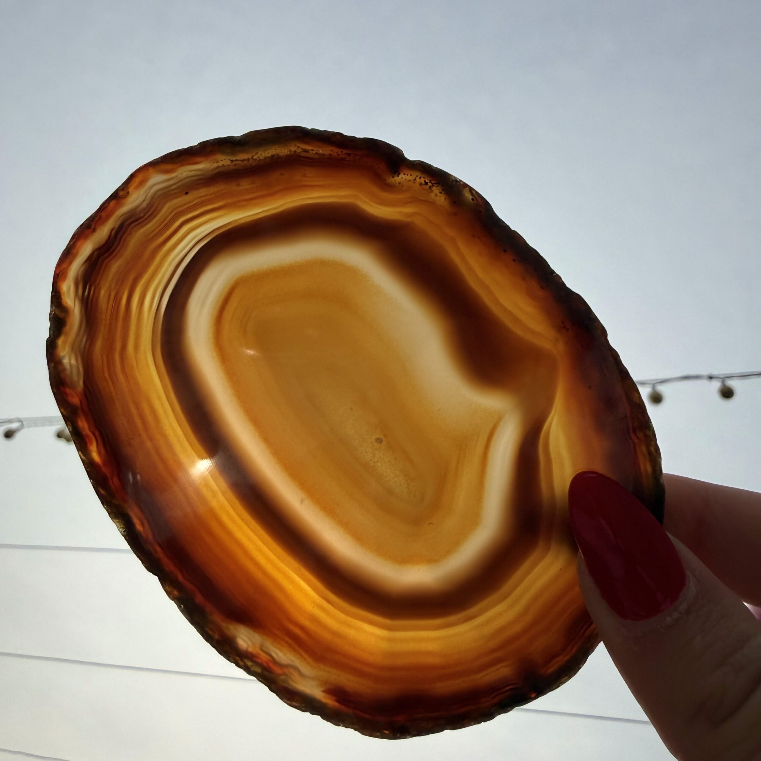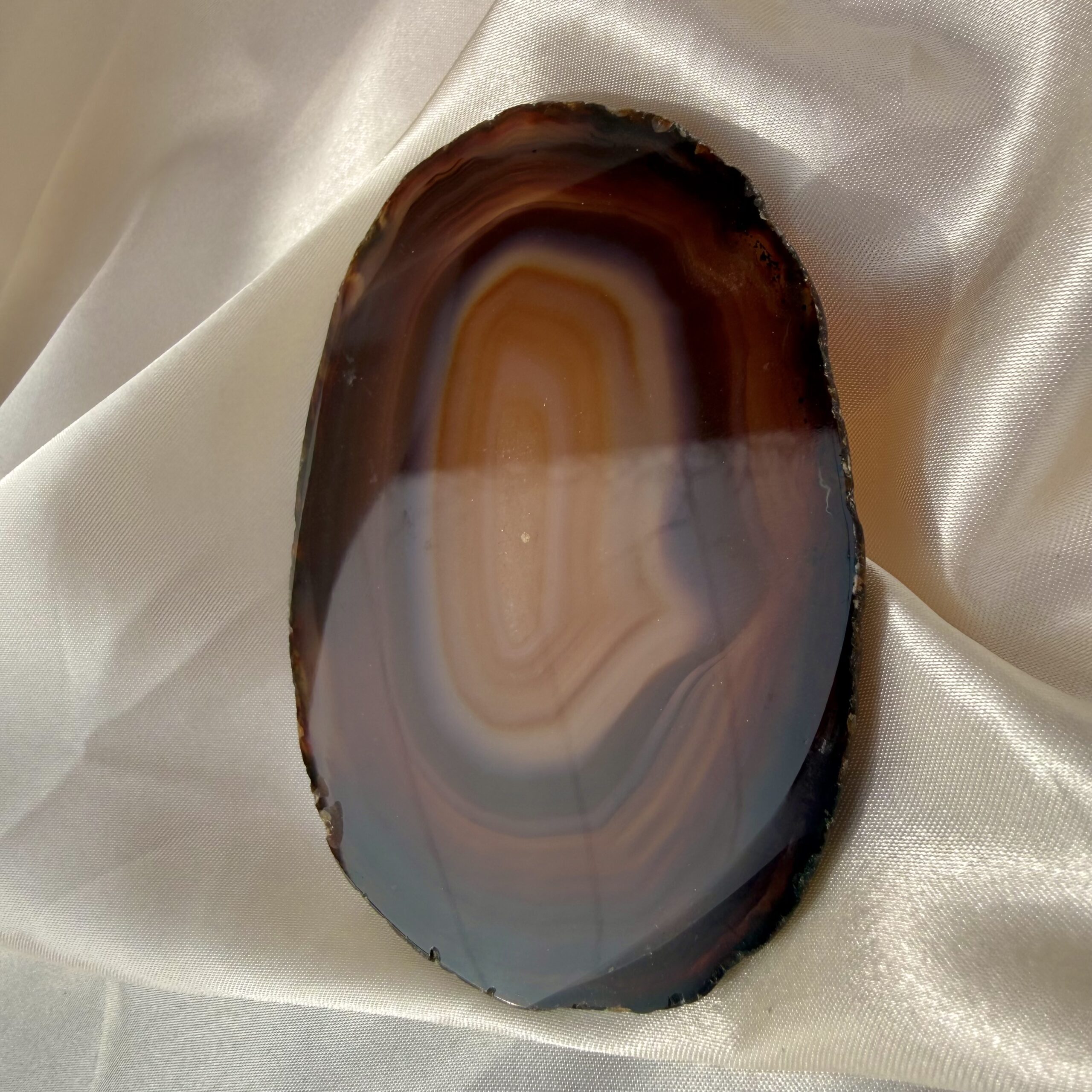 The colors are rich and beautifully balanced, ranging through warm earth tones, soft neutrals, or vibrant hues depending on the piece — all enhanced by the stone’s natural translucency. When light passes through, the slice comes alive, glowing softly and highlighting every delicate layer within.