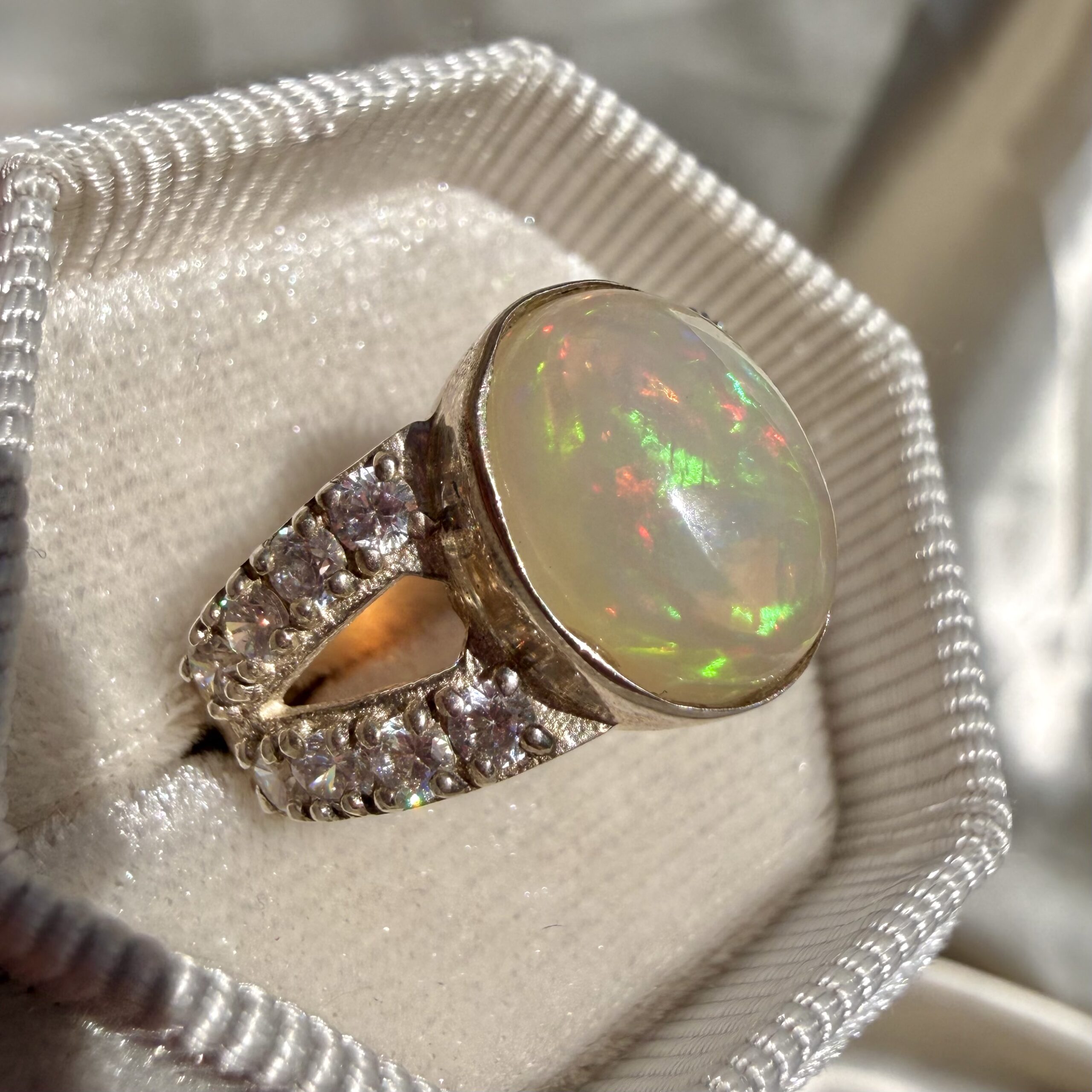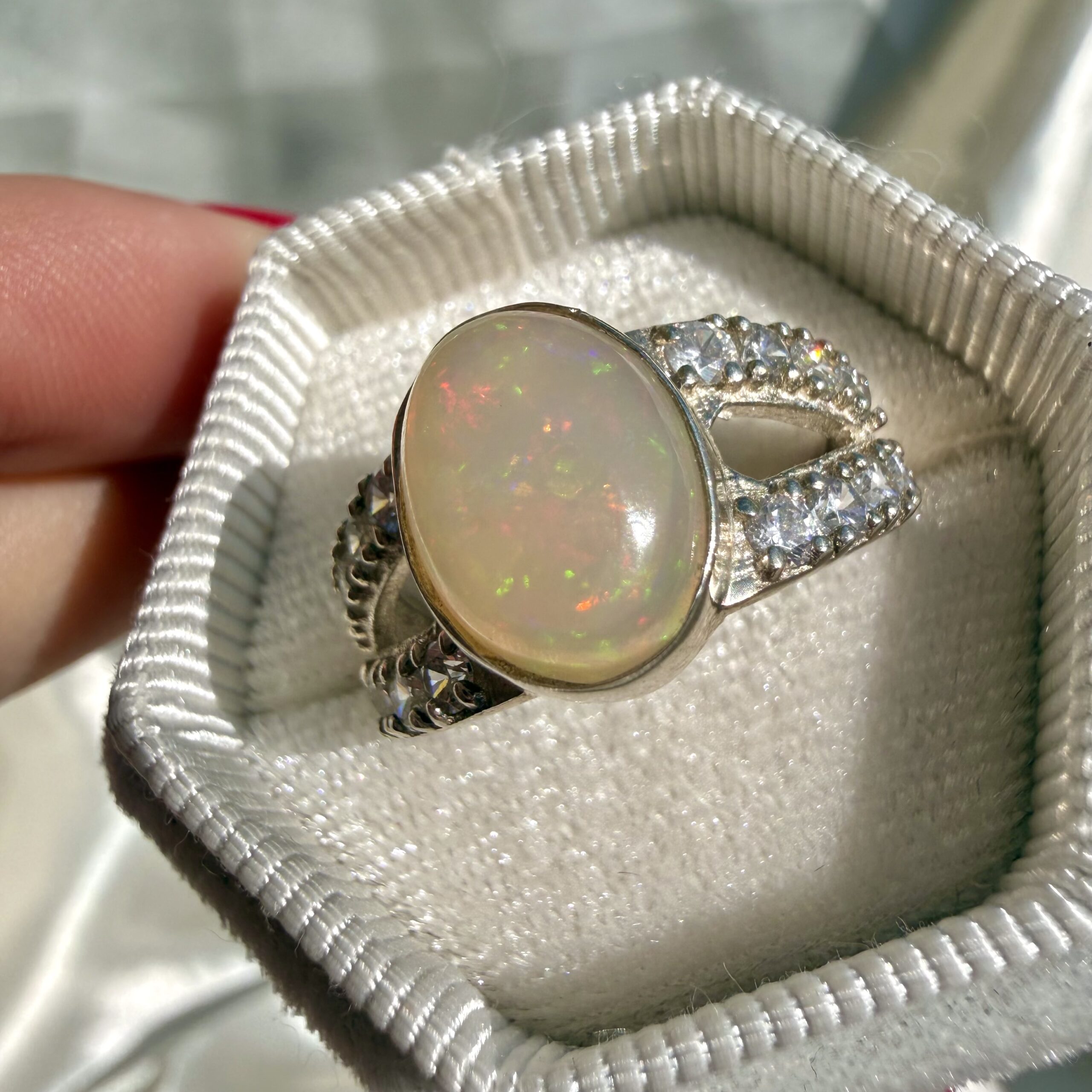 This mesmerizing ring showcases a radiant jelly opal, known for its translucent, almost glass-like appearance and vivid flashes of color. As light passes through the stone, it reveals a playful spectrum of rainbow hues, shifting and dancing with every movement.