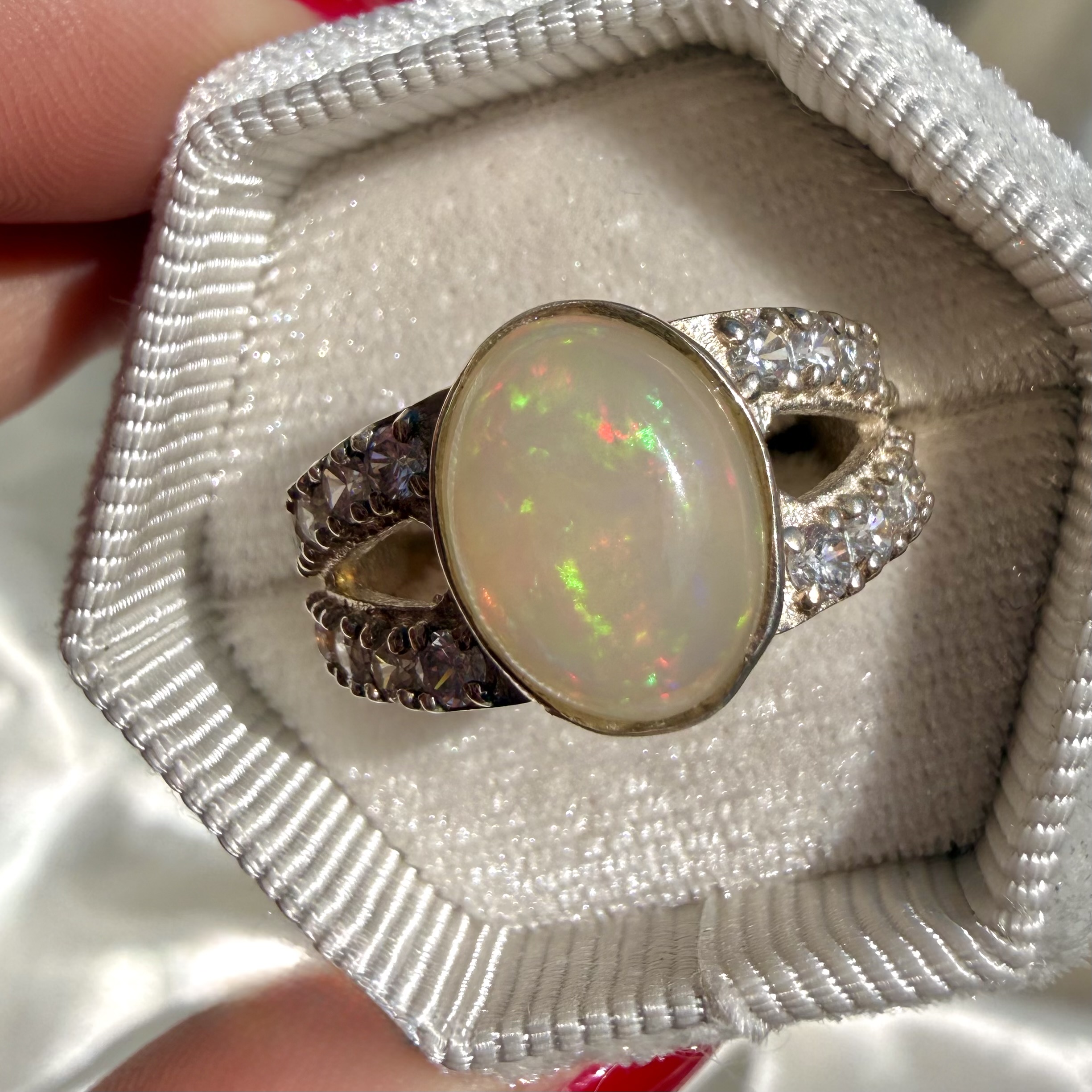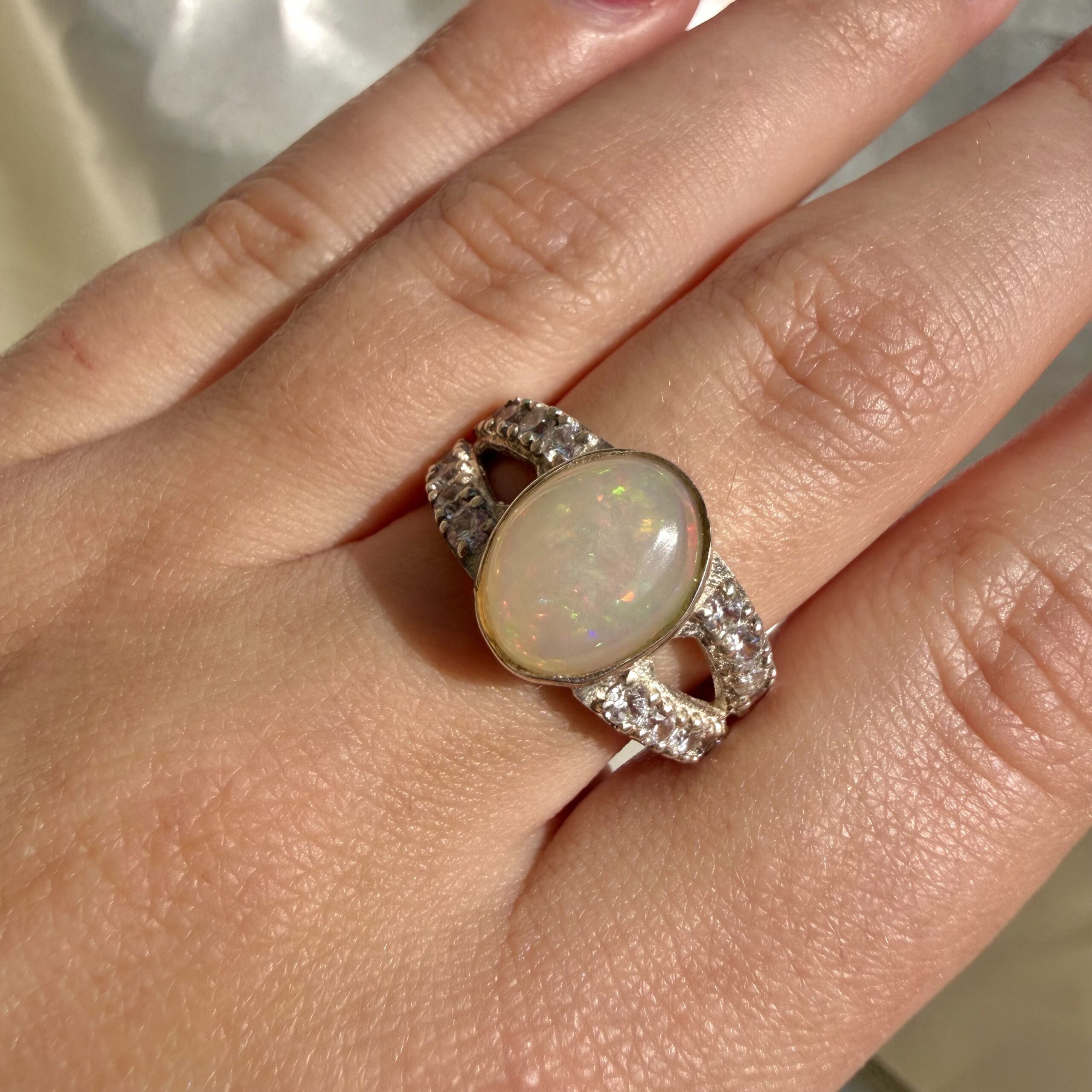 Set in solid Italian sterling silver (925), the opal is beautifully complemented by sparkling topaz accent stones, adding a refined brilliance that enhances its natural glow without overpowering it.
