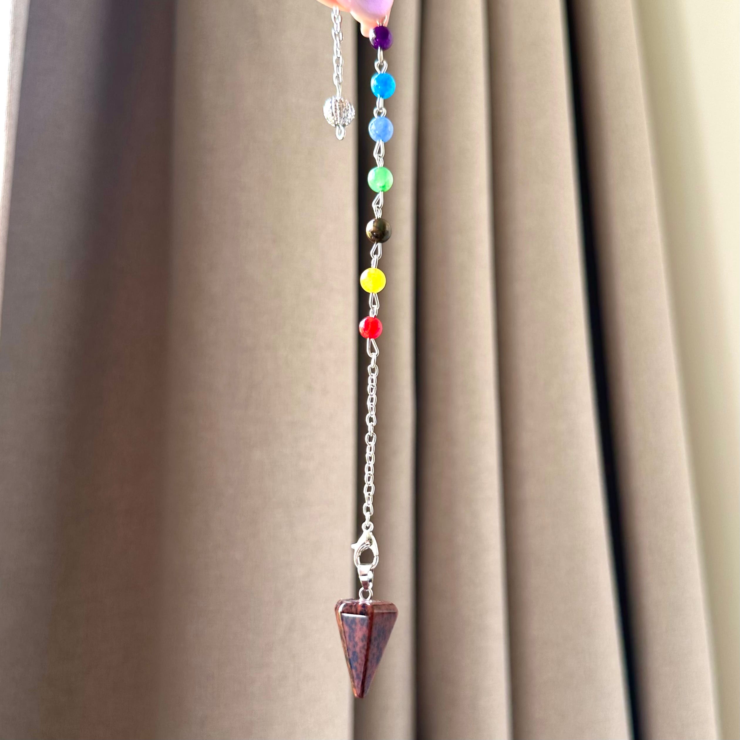 Embrace the grounding energy of the earth with our Chakra Energy Pendulum, featuring the harmonious blend of seven sacred stones and a mahogany obsidian pendulum. Reiki charged for amplified healing and balance. โจ