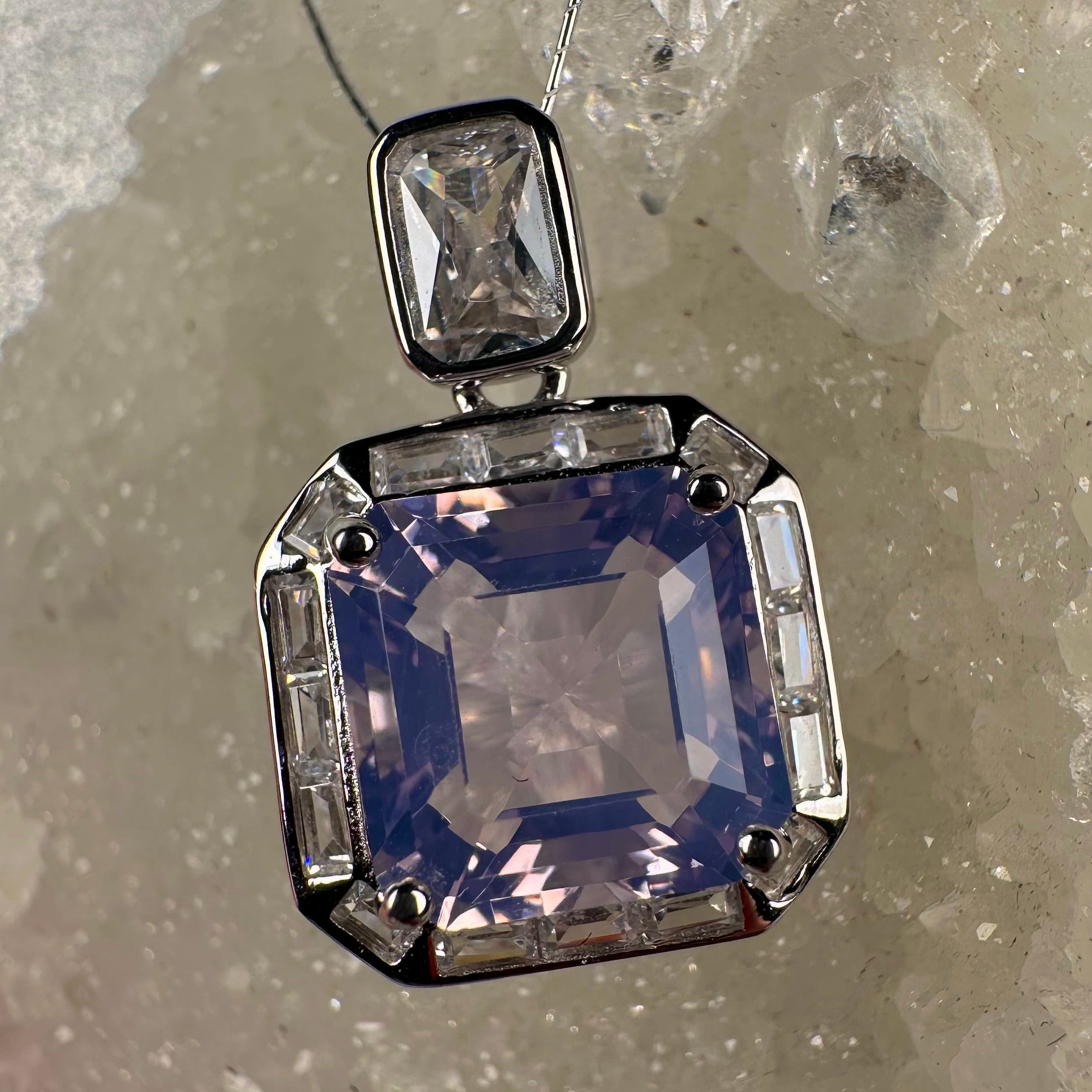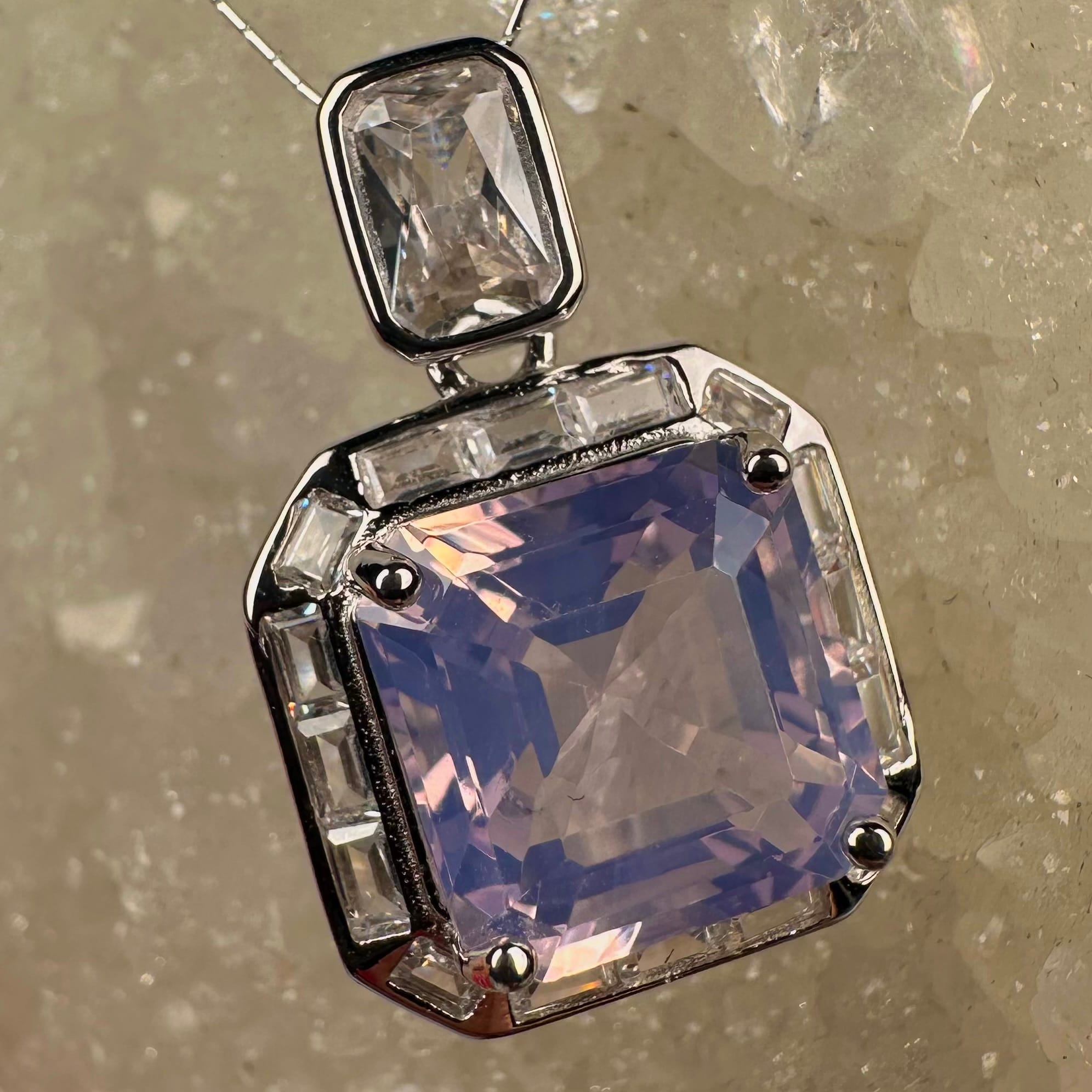 Introducing our *One-of-One Princess Lavender Moon Pendant*—a regal and enchanting piece that embodies rare beauty and timeless elegance. Crafted from sterling silver, this pendant features a stunning Radiant-cut AAA Lavender Moon Quartz, a gemstone of incredible rarity and allure. The quartz’s soft lavender hue is both captivating and serene, making it a truly unique treasure.