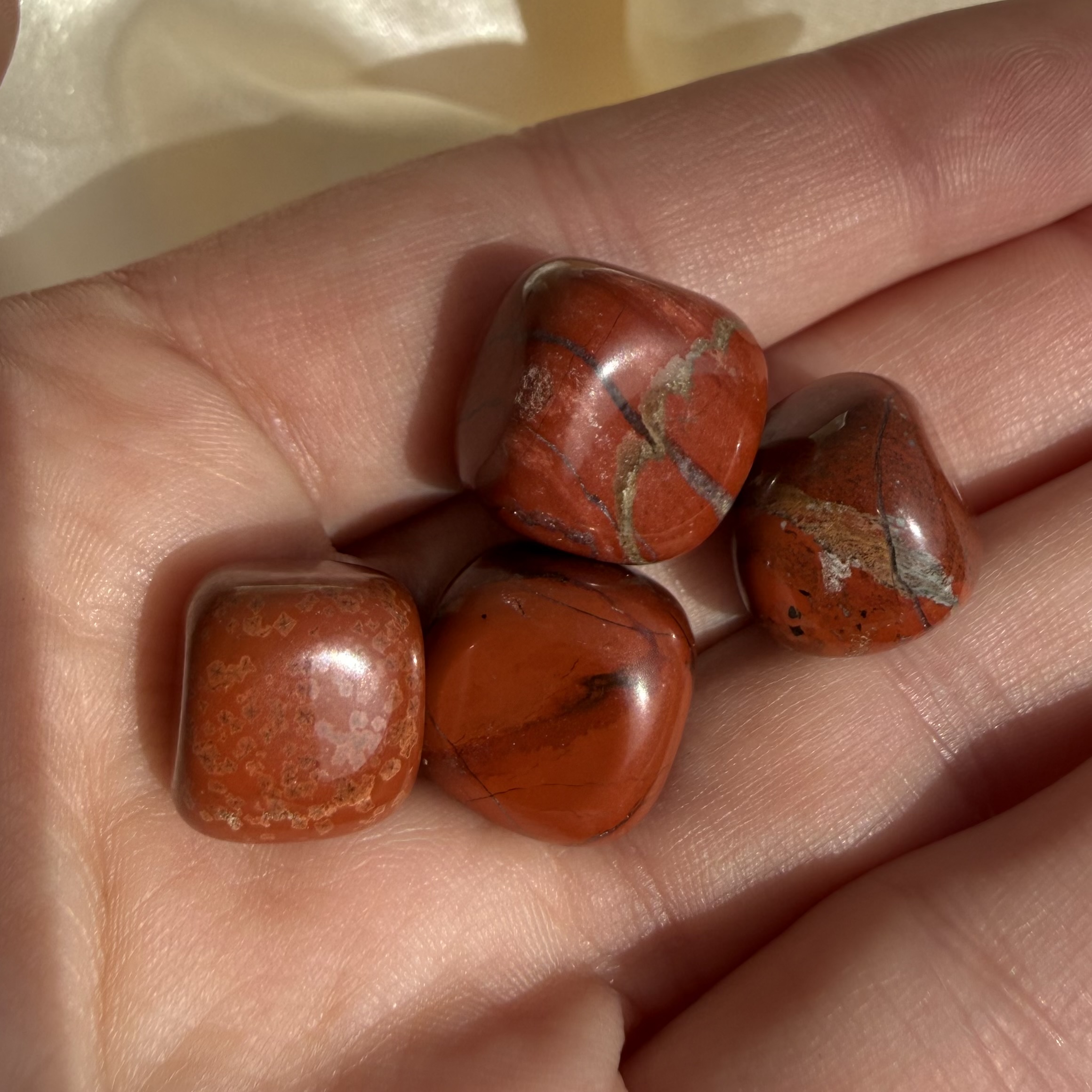 Every piece is intuitively chosen, meaning the one you receive is selected with care and intention. Because red jasper is a natural stone, each tumble will vary slightly in tone and pattern.