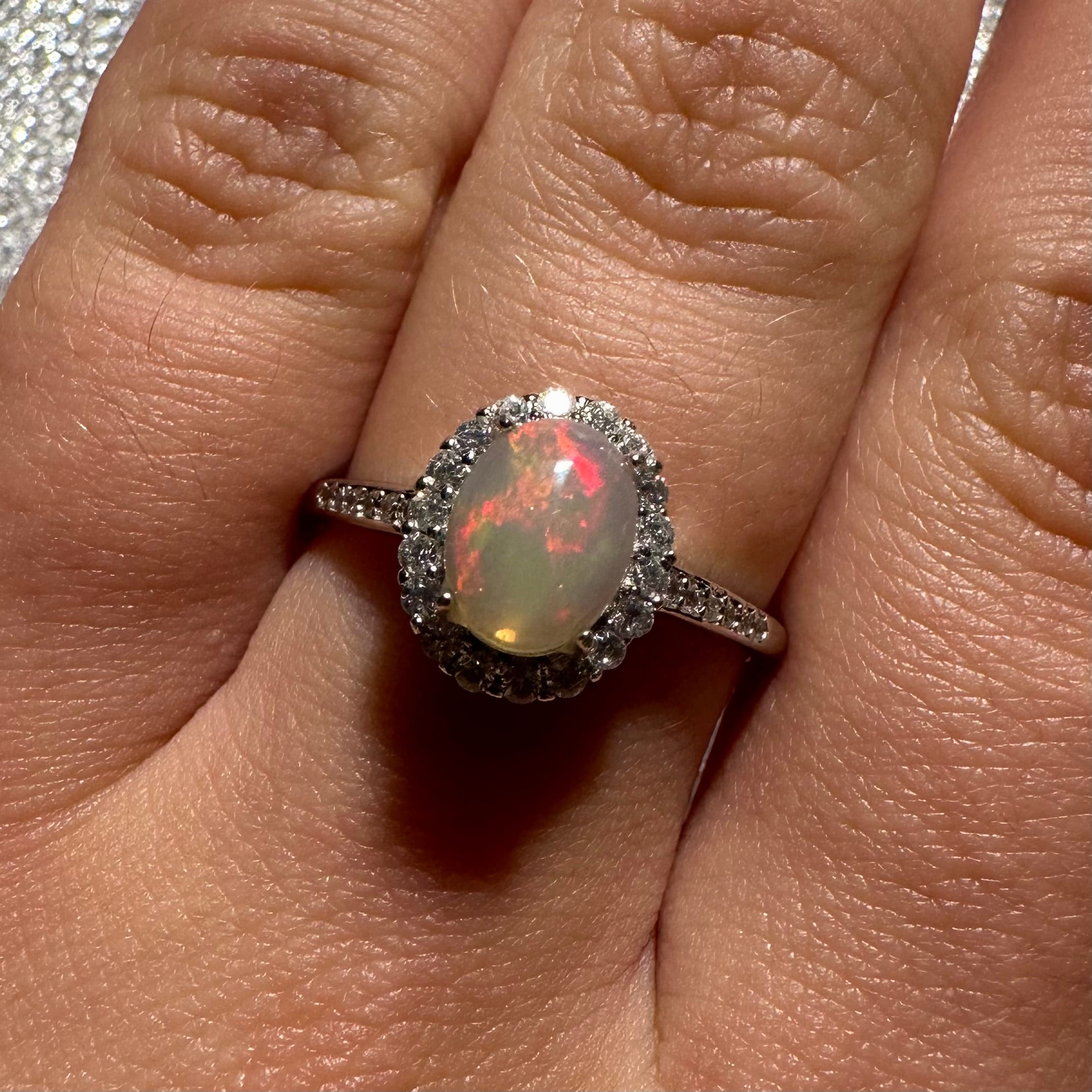 At the heart of this regal ring lies an incredibly high-quality Ethiopian opal. Known for its mesmerizing play of colors, this opal radiates hues that shift and shimmer with your every move. Each opal is hand-selected for its unique beauty, ensuring that no two rings are alike. Surrounding this captivating centerpiece are sparkling diamond CZ gemstones, adding an extra layer of brilliance and elegance.